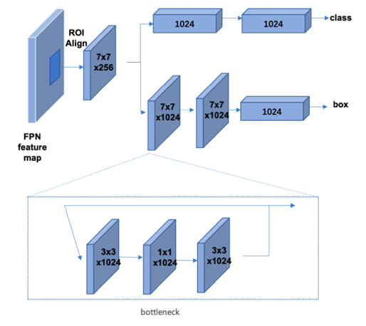 原始的HTC的box header只有两个全卷积层用于目标框的回归和分类,而增强版的双分支box header使用两个分支,分别预测框的坐标和类别。为了提高效率, 没有用过重的head结构,只使用一个bottleblock模块代替第一个卷积层,其他的卷积层不变;而对于分割rescoring分支,为了避免计算量过大,只在最后一个阶段加入分割rescoring分支,并用rescoring分支的结果取代原有的box分值赋给mask;而边缘分割分支,是在mask header里融入了边缘信息,来提升mask mAP。