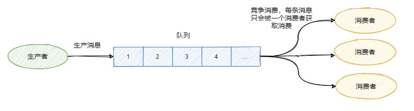 生产者往某个队列里面发送消息,一个队列可以存储多个生产者的消息,一个队列也可以有多个消费者, 但是消费者之间是竞争关系,即每条消息只能被一个消费者消费。