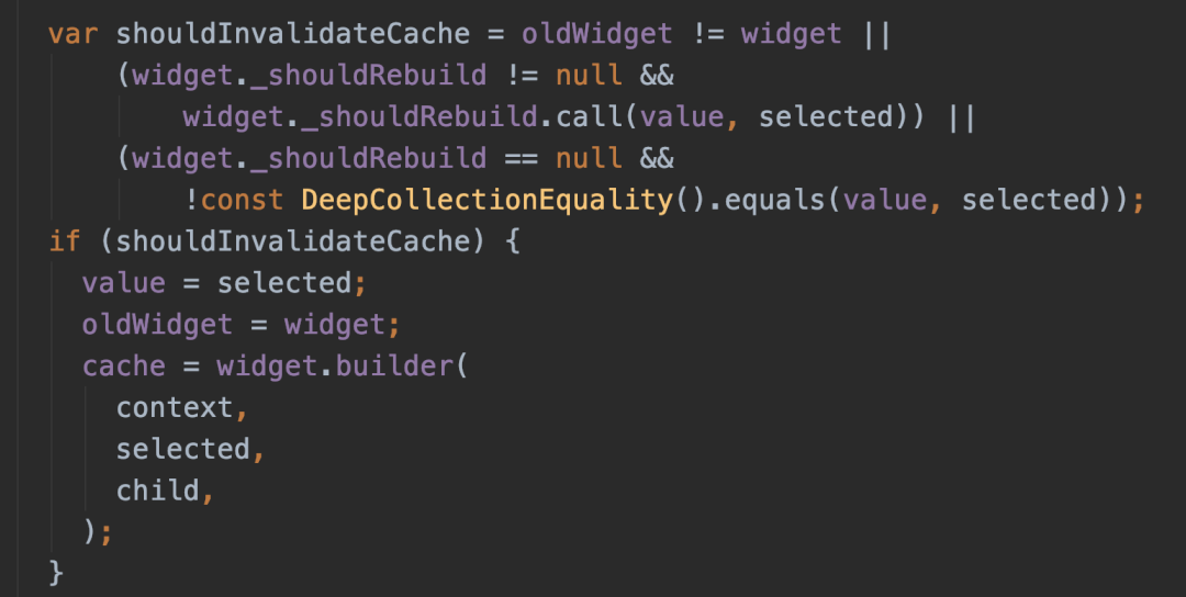 从源码可以发现,Selector判断的标准就是新旧数据Model是否「==」,如果是Collection类型,则通过DeepCollectionEquality来进行比较,官方建议使用https://pub.flutter-io.cn/packages/tuple 来进行简化判断