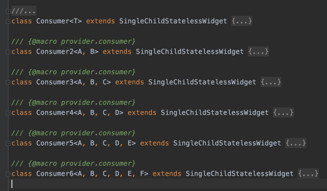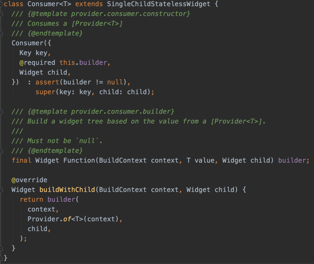 那么Consumer究竟是为什么可以实现更加精细的刷新控制呢?其实原理很简单,前面甚至已经提到了,那就是「在调用Provider.of的时候,会造成Context范围内的Widget执行Rebuild」,所以,只需要将调用的范围尽可能的缩小,那么执行Rebuild的范围就会越小,看下Consumer的源码。