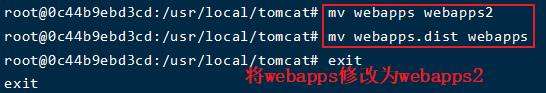 进入之后,修改webapps为webapps2或者修改webapps.dist为webapps就可以了