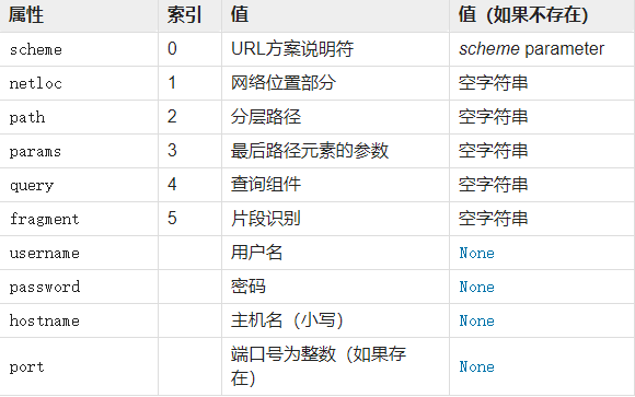 urlparse 方法是把一个完整的URL拆分成不同的组成部分,你可以根据自己的需求提取其中的某部分内容。返回结果ParseResult是namedtuple的子类,由以下10部分组成,每部分既可以通过名字获取也可以通过下表索引得到。