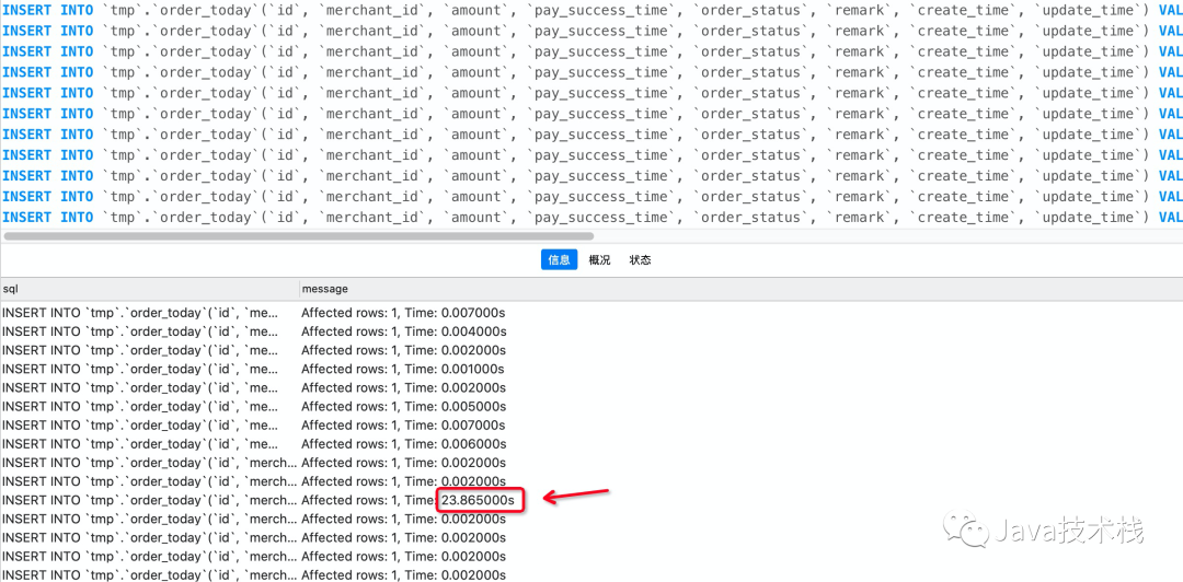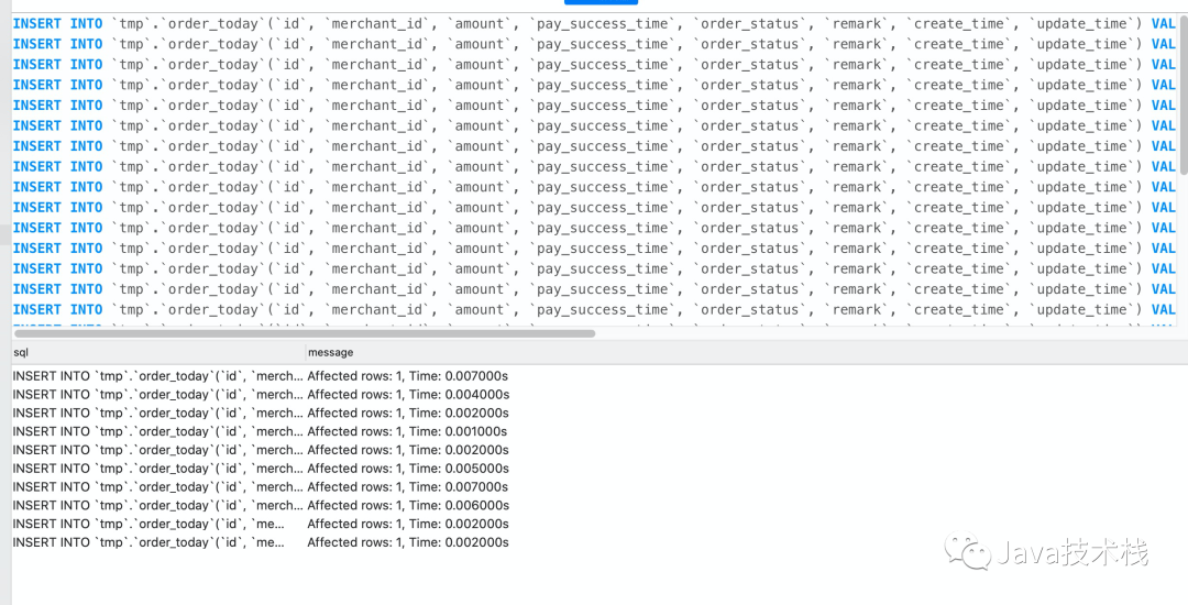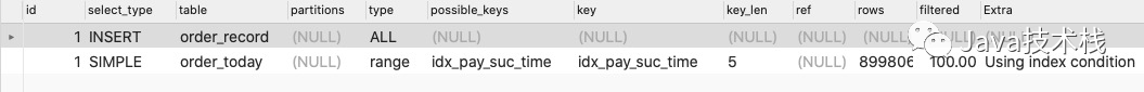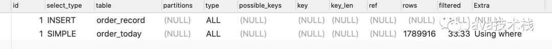 通过观察迁移sql的执行情况你会发现order_today是全表扫描,也就意味着在执行insert into select from 语句时,mysql会从上到下扫描order_today内的记录并且加锁,这样一来不就和直接锁表是一样了。