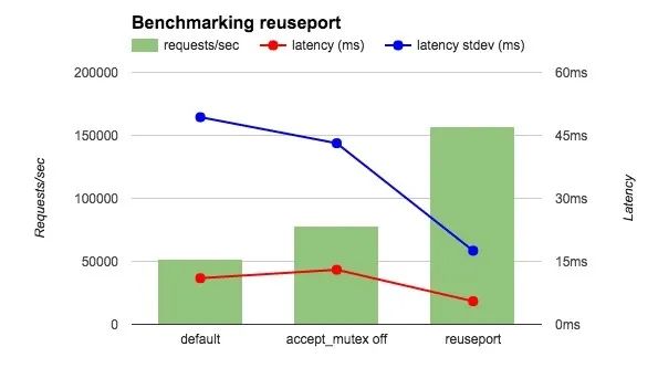 当然,在1.11.3版本后,Nginx默认关闭了accept_mutex锁,这是因为操作系统提供了reuseport(Linux3.9版本后才提供这一功能)这个更好的解决方案。我们先来看一下处理新连接的性能对比图:
