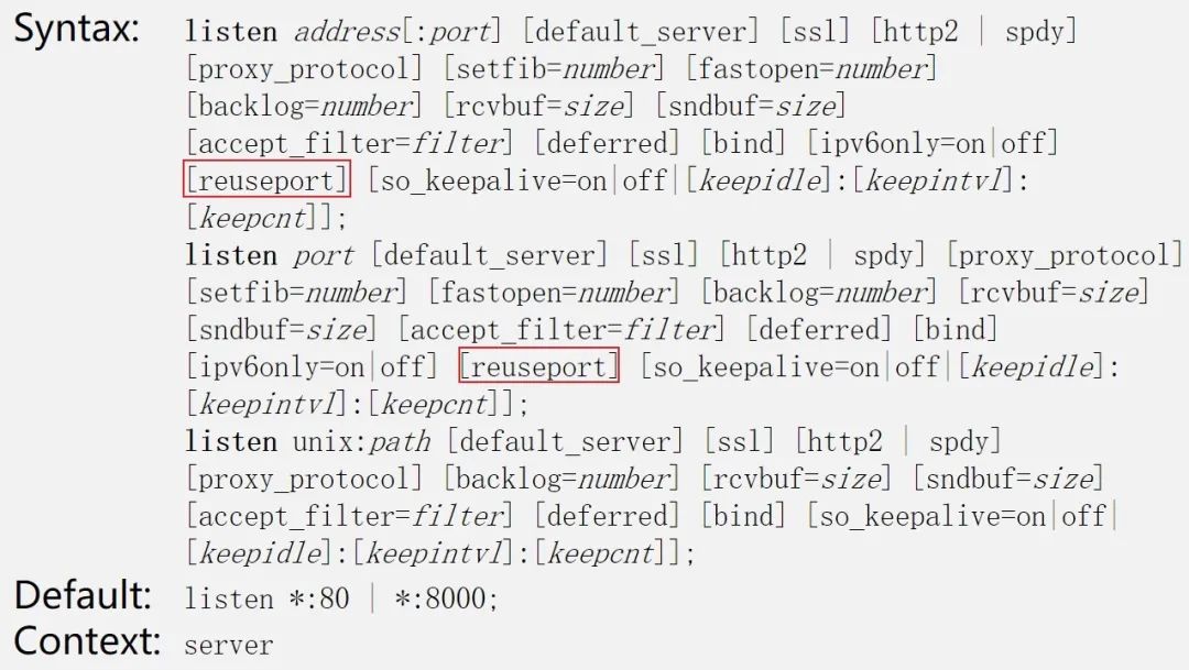 这样,Worker进程的执行效率就高了很多!如果你想开启reuseport功能,只需要在listen指令后添加reuseport选项即可: