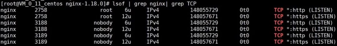 由于子进程自然继承了父进程已经打开的端口,所以Worker进程也在监听80和443端口,你可以用lsof命令看到这一点: