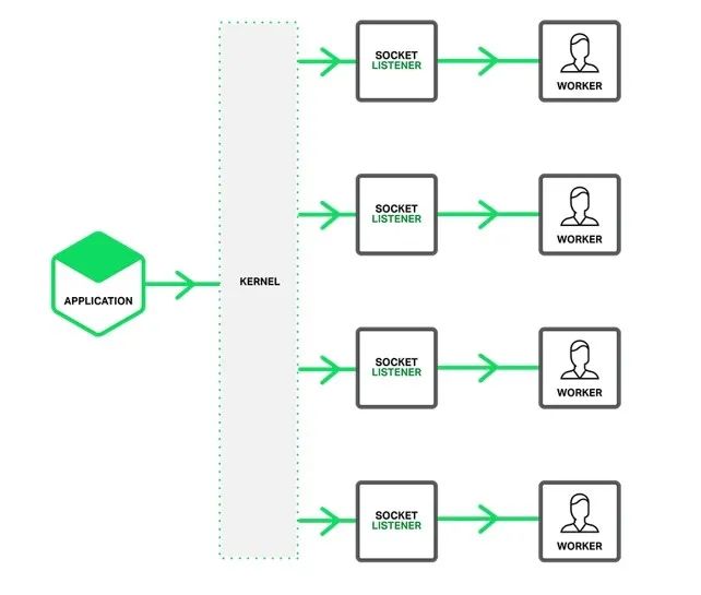 reuseport能够做到这么高的性能,是因为内核为每个Worker进程都建立了独立的ACCEPT队列,由内核将建立好的连接按负载分发到各队列中,如下图所示: