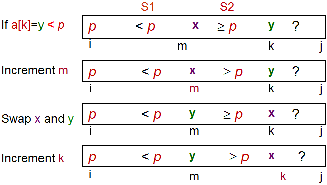 private int partition(int[] array, int i, int j) { int randomIndex=i+new Random().nextInt(j-i); log.info("randomIndex:{}",randomIndex); swap(array, i , randomIndex); int middleValue = array[i]; int middleIndex = i; for (int k = i+1; k <= j; k++) { if (array[k] < middleValue) { middleIndex++; swap(array, k , middleIndex); } } swap(array, i, middleIndex); return middleIndex; }