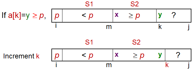 private int partition(int[] array, int i, int j) { int middleValue = array[i]; int middleIndex = i; for (int k = i+1; k <= j; k++) { if (array[k] < middleValue) { middleIndex++; swap(array, k , middleIndex); } } swap(array, i, middleIndex); return middleIndex; }