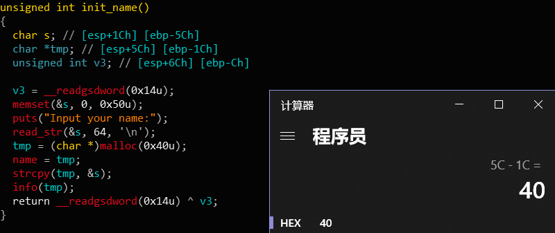 在一开始要求输入 name 的时候后面有一个 strcpy 函数,注意 s 跟 tmp 距离 ebp 的位置,当输入的的 name 够了 0x40 的时候会把 tmp 的地址一起复制过去(strcpy 遇到 \x00 截断)那么可以通过这个来泄漏 heap 的地址