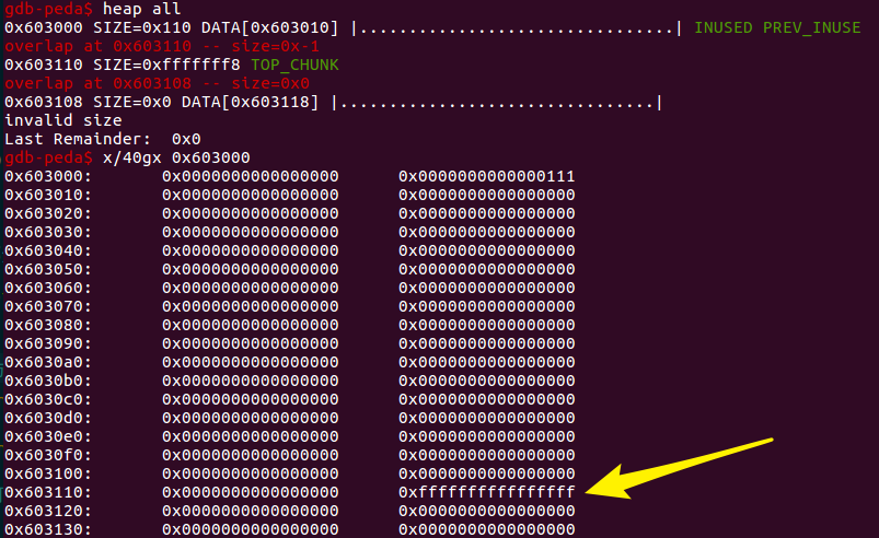 我们想要让 new_top 到 0x602060,0x602060-0x20 =old_top + size,所以这个 size 应该是 0x602040-old_top=0xffffef30 即 0xffffffffffffef30,也就是说只要申请 0xffffffffffffef30 大小的 chunk 就能把 top chunk 改到0x602060-0x10,然后再申请一个的时候就是 0x602060 了