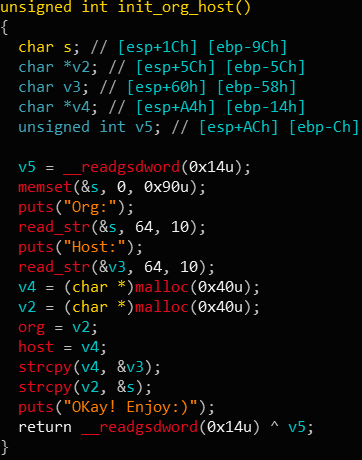 p.sendlineafter('Org:\n','a'*0x40)