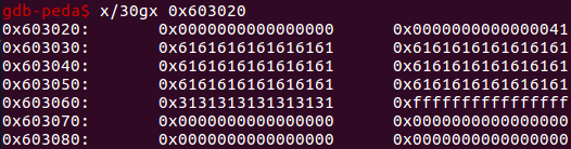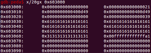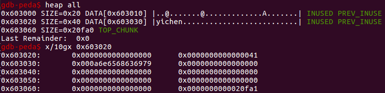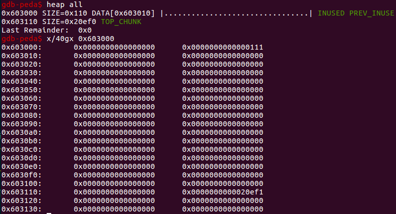 想要修改那个指针就需要 malloc 申请到 topchunk - 0x60 也就是 0x603000 那里,另外还要减去 0x10 我们申请的那个 size 的 chunk 头的大小