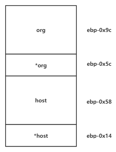 这些个指针什么的画个图来看一下,当我们把 org 中填充满了,然后他就会把后面的 *org 与 host 也给复制过来,那 host 那个地方如果写上 0xffffffff 的话就可以把 top chunk 的 size 给覆盖掉了