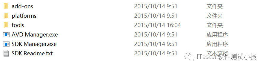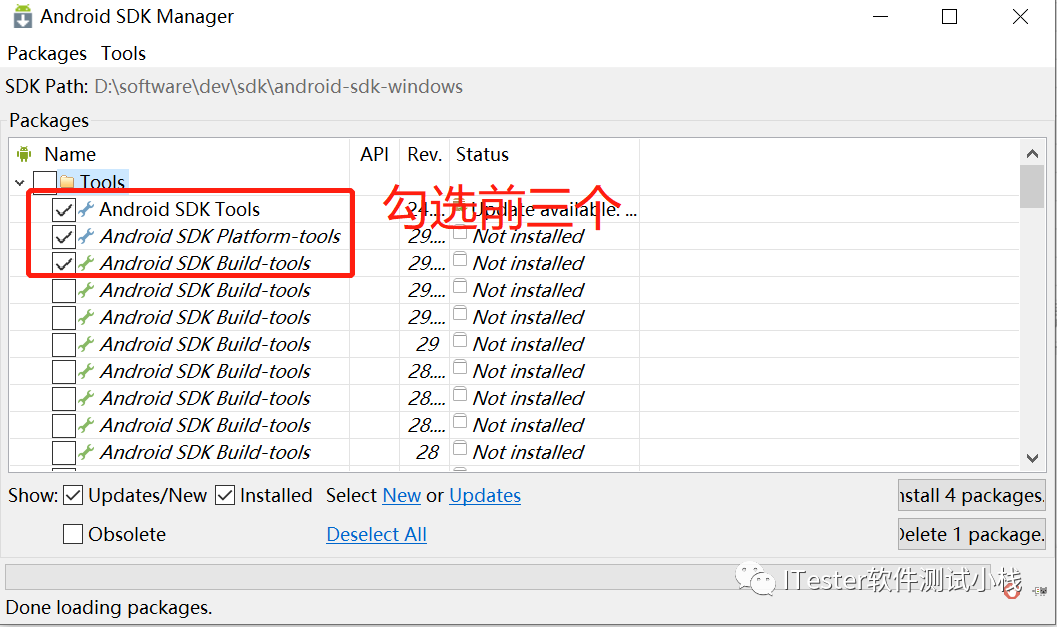 ③ 双击目录里的SDK Manager.exe,勾选Tools的前三项:Android SDK Tools、Android SDK Platform tools、Android SDK Build-tools。
