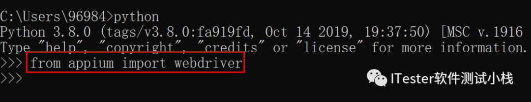 ②安装成功后,进入python shell模式,输入:from appium import webdriver