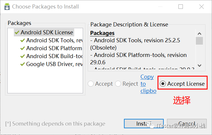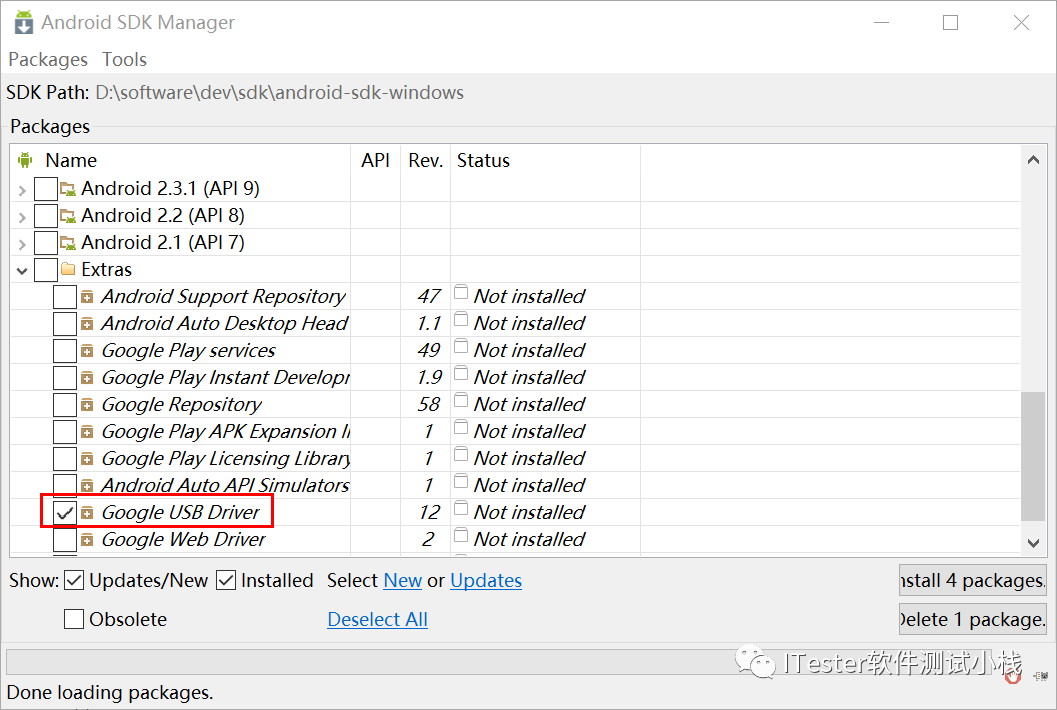 ④ 选择Extras中的Google USB Driver,然后点击右下角的install进行安装。