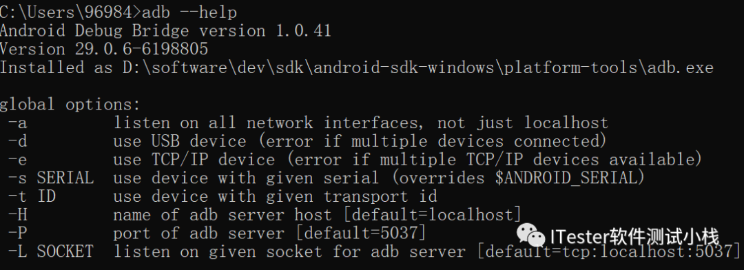 ③ 配置完成后,快捷键win+R,输入cmd打开dos窗口,输入命令:adb --help,查看sdk是否安装配置成功。