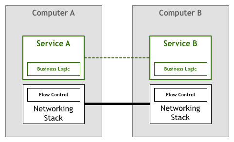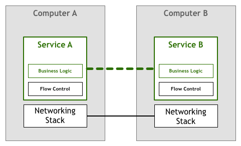 然而现实远比想象的复杂,在实际情况中,通信需要底层能够传输字节码和电子信号的物理层来完成,在TCP协议出现之前,服务需要自己处理网络通信所面临的丢包、乱序、重试等一系列流控问题,因此服务实现中,除了业务逻辑外,还夹杂着对网络传输问题的处理逻辑。