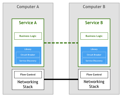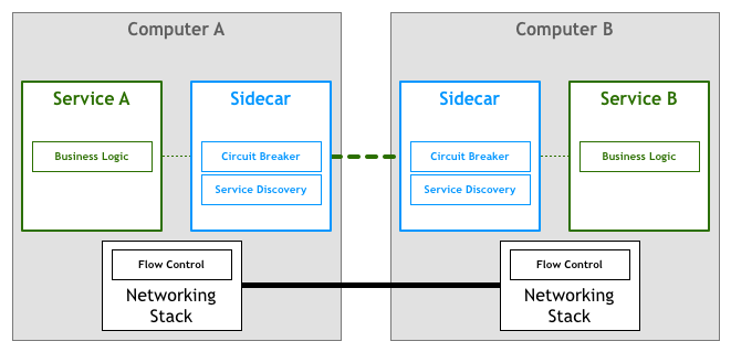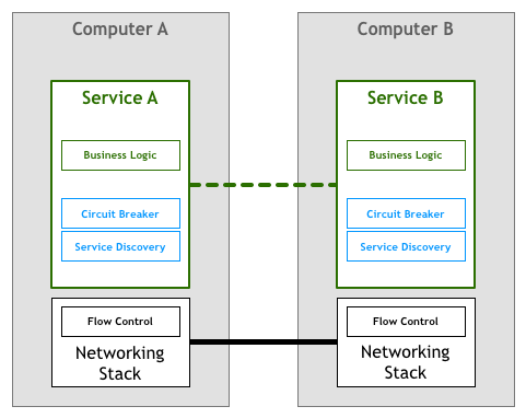 在TCP出现之后,机器之间的网络通信不再是一个难题,以 GFS / BigTable / MapReduce 为代表的分布式系统得以蓬勃发展。这时,分布式系统特有的通信语义又出现了,如熔断限流、负载均衡、服务发现、认证授权、安全加密、trace和监控等等,于是服务根据业务需求来实现一部分所需的通信语义。