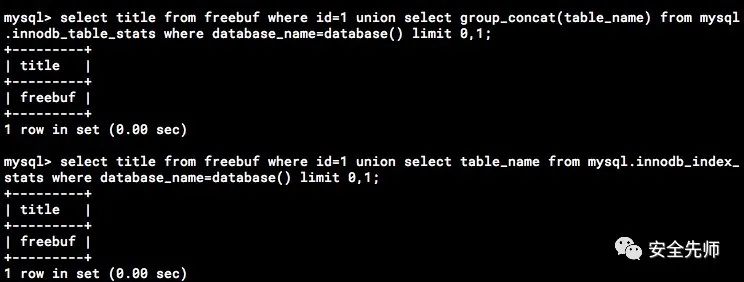select title from freebuf whereid=1unionselect table_name from mysql.innodb_table_stats where database_name=database() limit0,1; select title from freebuf whereid=1unionselect table_name from mysql.innodb_index_stats where database_name=database() limit0,1;