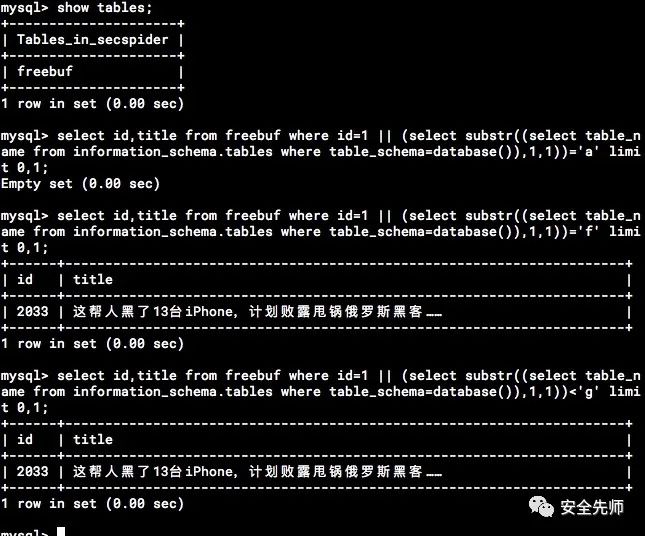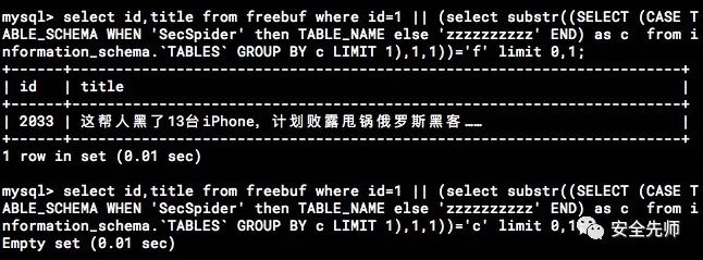 selectid,title from freebuf whereid=1 || (selectsubstr((select (case table_schema WHEN'SecSpider'then table_name else'zzzzzzzzzz'END) as c from information_schema.tables groupby c limit1),1,1))='f'limit0,1;