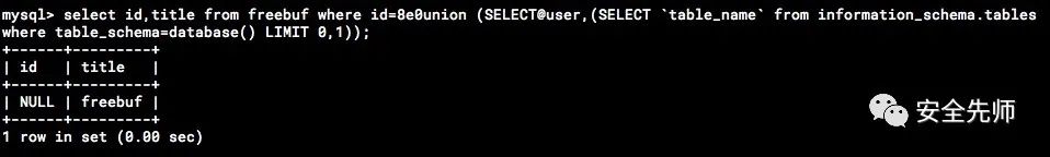 select id,title from freebuf where id=8e0union (SELECT@user,(SELECT `table_name` from information_schema.tables where table_schema=database() LIMIT 0,1));