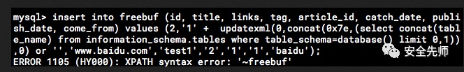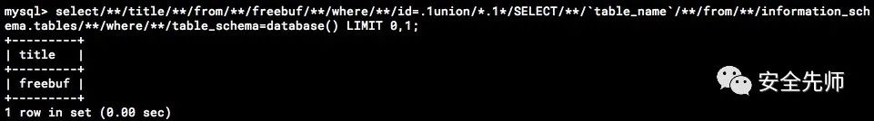 select title from freebuf whereid=-1unionselect table_name from information_schema.tables where table_schema=database() limit0,1;