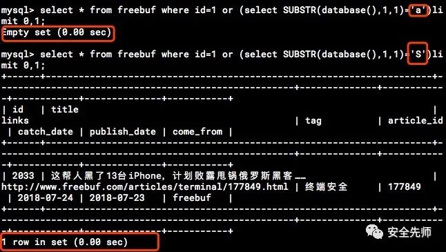 selectid,title from freebuf whereid=1 || (selectsubstr((select table_name from information_schema.tables where table_schema=database()),1,1))='f'limit0,1;