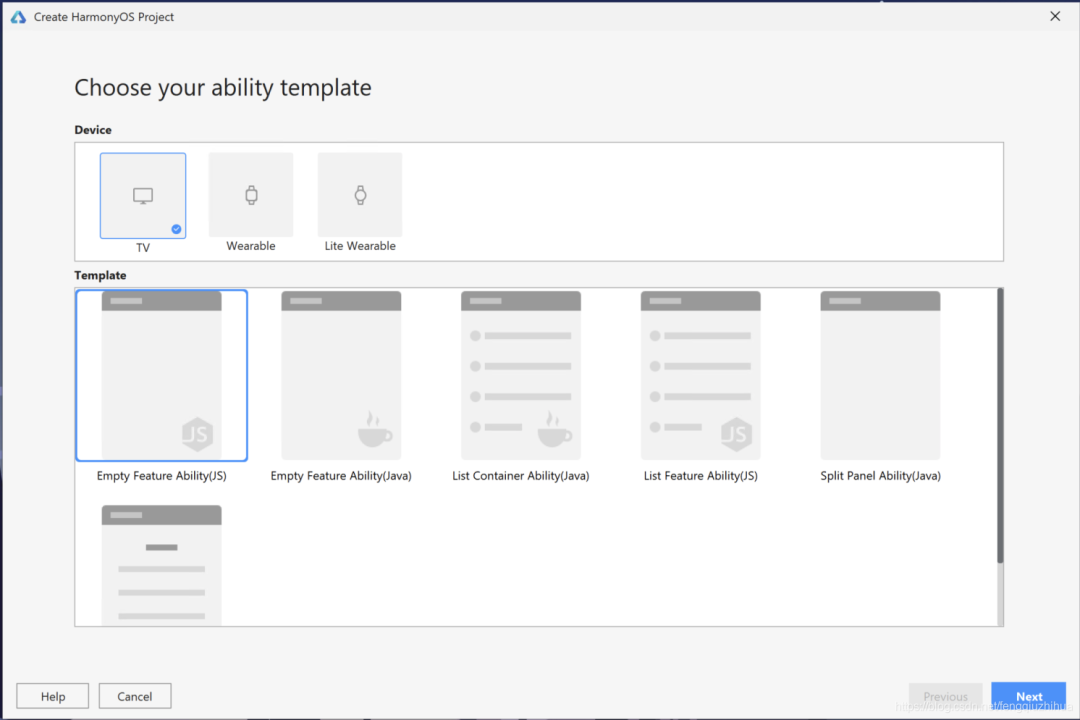 打开 DevEco,在欢迎界面中选择 Create HarmonyOS Project,然后在 Choose your ability template 界面中,Device 下选择 TV,Template 选择 Empty Feature Ability(JS) 创建一个空的 JS 项目。