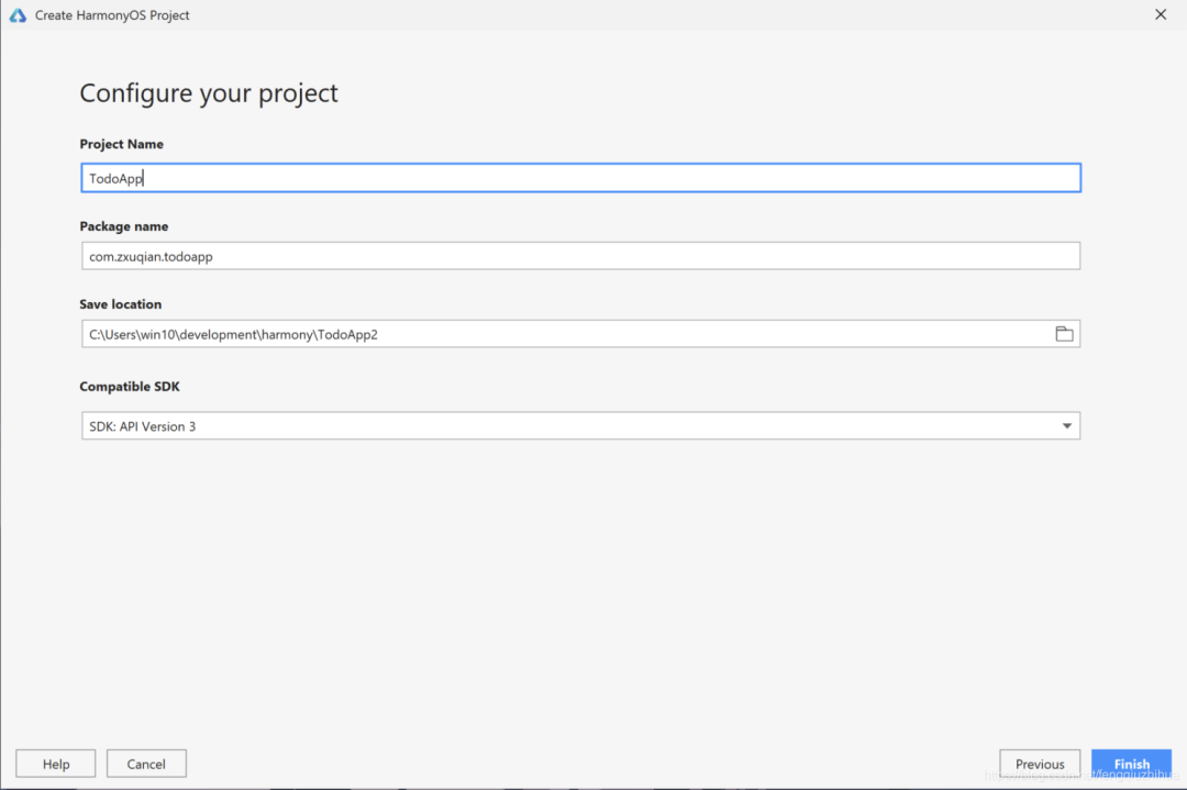 点击 Next,在 Configure your project 界面输入项目信息。在 Project Name 中输入 TodoApp,Package name 我这里使用了 com.zxuqian.todoapp,在 save location 中选择项目的保存路径,Compatible SDK 保持默认就好,填写完成之后点击 Finish 完成项目的创建。