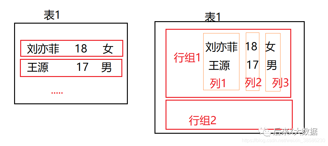 列式存储的存储方式,是按照一列一列存储的,如上图中的右图,这样的话如果查询一个字段的数据,就等于是索引查询,效率高。但是如果需要查全表,它因为需要分别取所有的列最后汇总,反而更占用资源。于是ORC行列式存储出现了。
