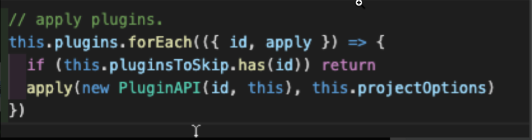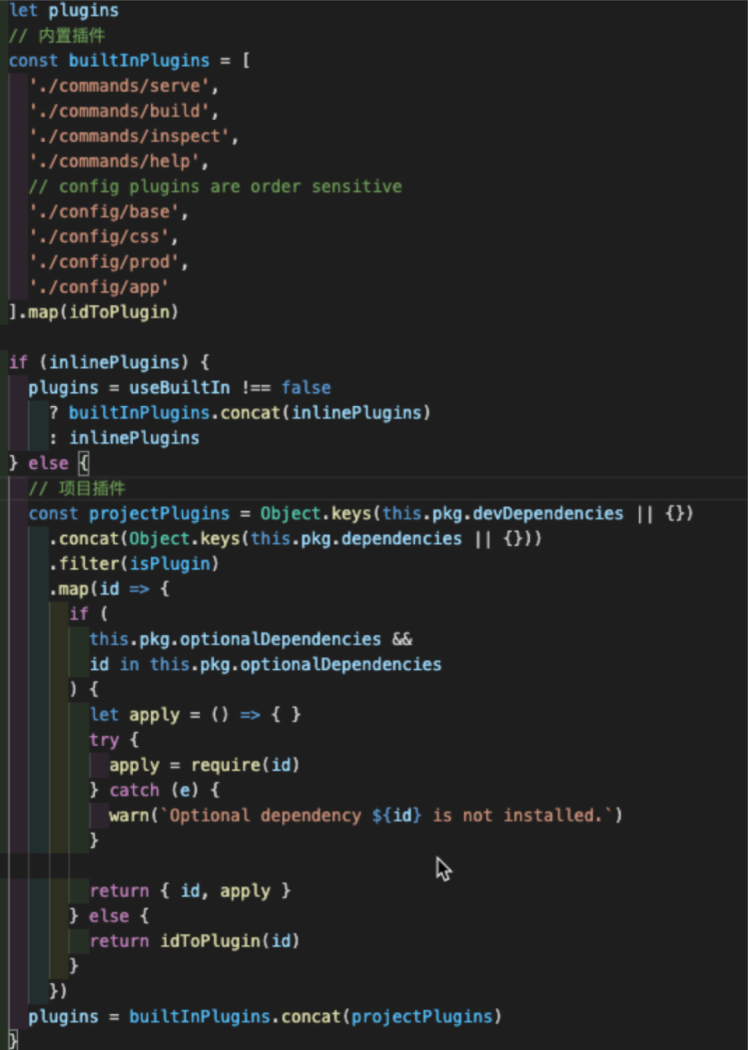pluginCore:@vue/cli-service [19],通过package.json中获得项目插件后,与系统内置插件合并,最后依次执行;