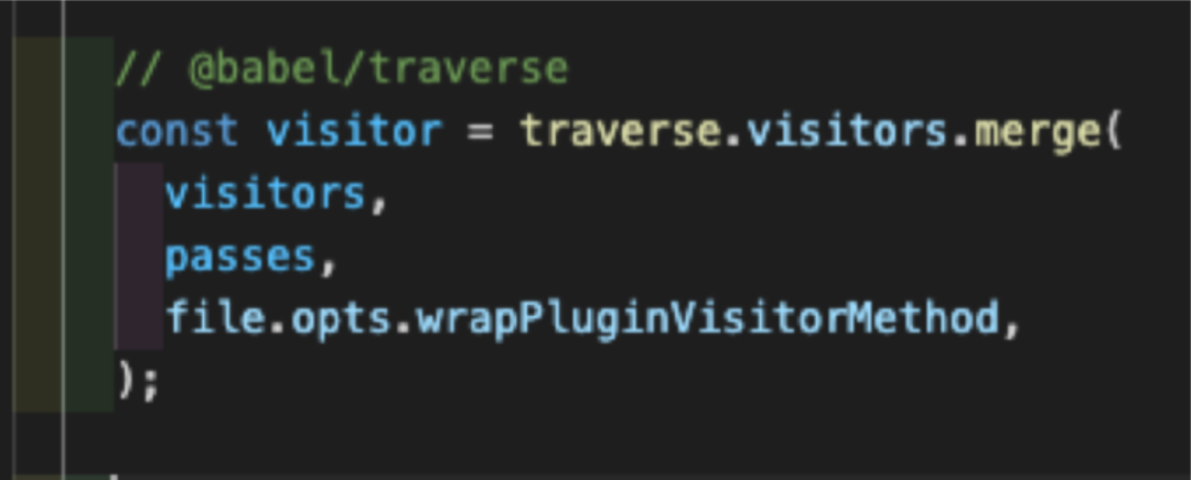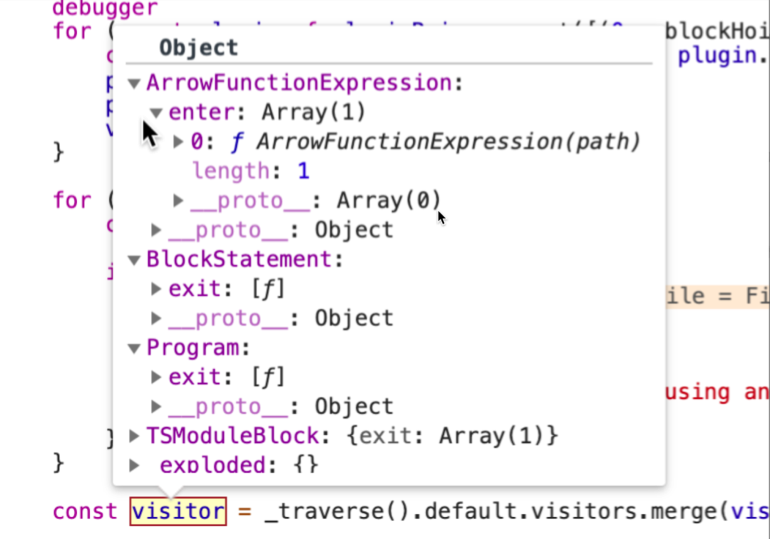 第三步,将多个包含vistor字段对象整合成一个大的visitor源码展示(详细逻辑:@babel/core/src/transformation/index.js [5]):