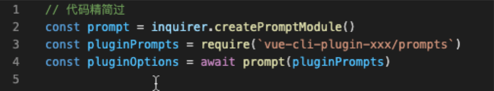 第二步:require('vue-cli-plugin-xxx/prompts'),并获取用户安装是选项结果pluginOptions,源码位置:@vue/cli/lib/invoke.js [11]
