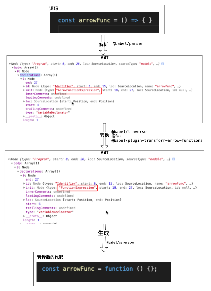 第二步,ATS遍历节点,检测nodePath的type === 'ArrowFunctionExpression',寻找到vistor对象的中key为 ArrowFunctionExpression的函数;