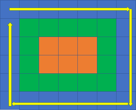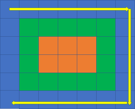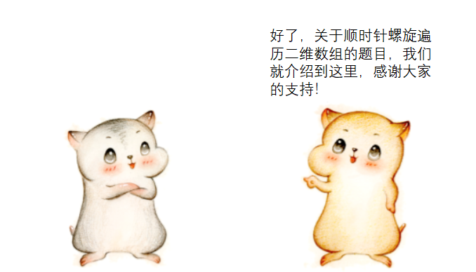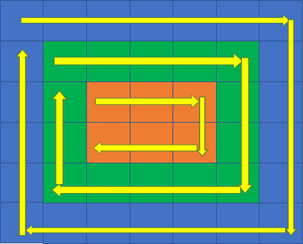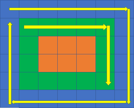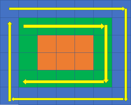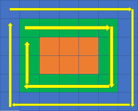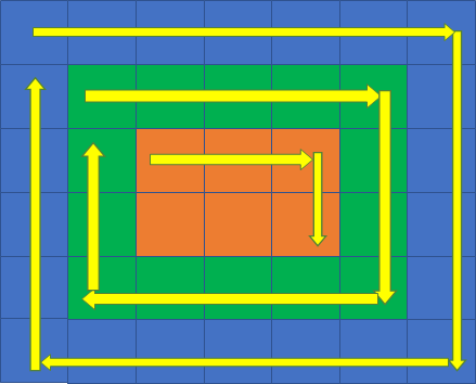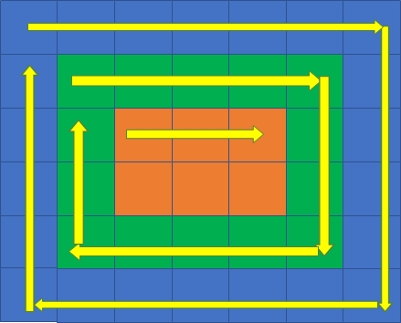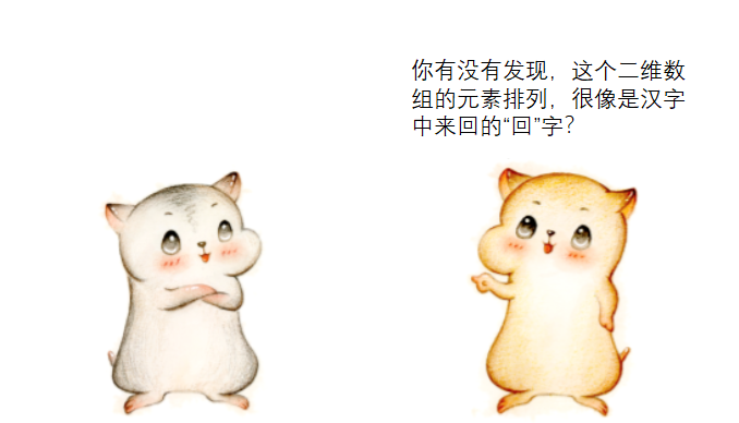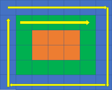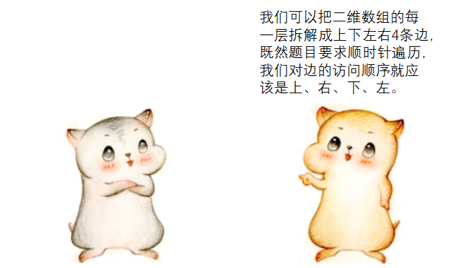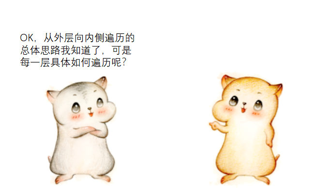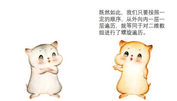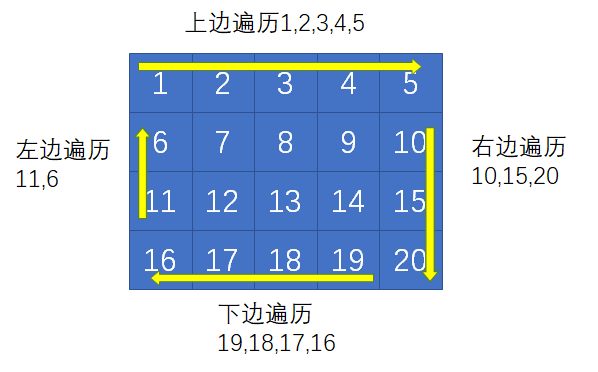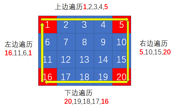 在上面的代码中,一个大循环当中包含了4个小循环。大循环控制了每一层的遍历,4个小循环分别实现了同一层上边、右边、下边,左边的遍历。