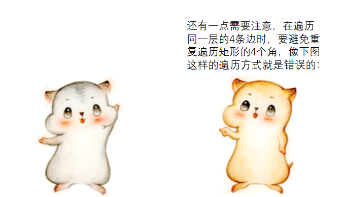 当遍历到最内层时,4个小循环并不会全都执行,比如测试代码中matrix2的最内层只有一个元素13,那么执行完第1个小循环,就不会再进入后面3个小循环: