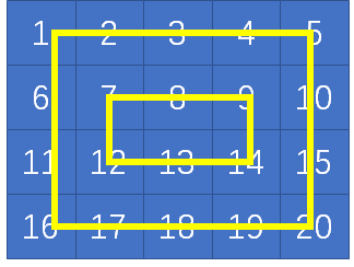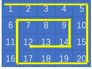 1,2,3,4,5,10,15,20,19,18,17,16,11,6,7,8,9,14,13,12