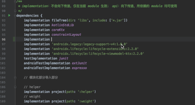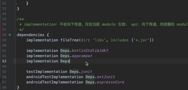 // 这里采用直接倒入定义的 Deps 以及 Versions 分组方式import static Deps.*import static Versions.*apply plugin: 'com.android.library'apply plugin: 'kotlin-android'apply plugin: 'kotlin-android-extensions'android {// 这里就可以直接使用对应的属性compileSdkVersion compileSDKbuildToolsVersion buildToolsdefaultConfig {minSdkVersion minSDKtargetSdkVersion targetSDKversionCode appVersionCodeversionName appVersionNametestInstrumentationRunner "androidx.test.runner.AndroidJUnitRunner"consumerProguardFiles 'consumer-rules.pro'}// ...}dependencies {implementation fileTree(dir: 'libs', include: ['*.jar'])// 同理,这里也是一样,直接使用对应的属性名即可implementation kotlinStdLibimplementation appcompatimplementation coreKtxapi 'com.google.android.material:material:1.2.0'testImplementation junitandroidTestImplementation extJunitandroidTestImplementation espressoapi mmkvapi 'com.airbnb.android:lottie:3.4.1'}