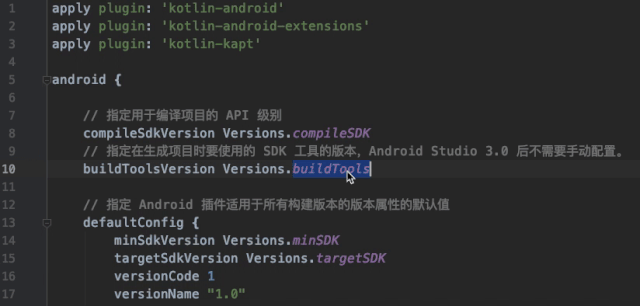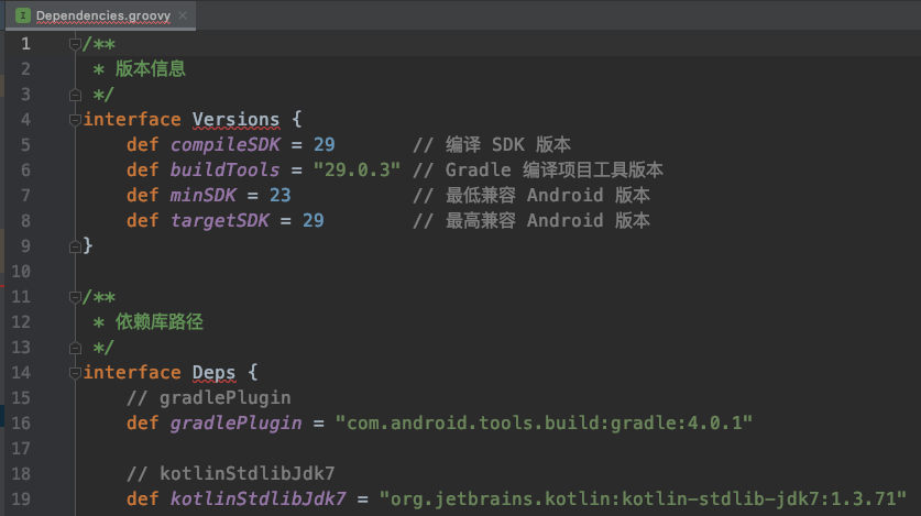 @file:Suppress("SpellCheckingInspection")/*** @author HLQ_Struggle* @date 2020/7/27* @desc 统一管理类*/// 统一管理项目中的版本信息object Versions {// Build Configconst val compileSDK = 29 // 编译 SDK 版本const val buildTools = "29.0.3" // Gradle 编译项目工具版本const val minSDK = 23 // 最低兼容 Android 版本const val targetSDK = 29 // 最高兼容 Android 版本// App Versionconst val appVersionCode = 1 // 当前版本编号const val appVersionName = "1.0" // 当前版本信息// 。。。}// 统一管理项目中使用的依赖库object Deps {// Gradleconst val androidGradle = "com.android.tools.build:gradle:${Versions.androidGradlePlugin}"// Kotlinconst val kotlinStdLib = "org.jetbrains.kotlin:kotlin-stdlib-jdk7:${Versions.kotlin}"const val kotlinGradlePlugin = "org.jetbrains.kotlin:kotlin-gradle-plugin:${Versions.kotlin}"const val kotlinxCoroutines ="org.jetbrains.kotlinx:kotlinx-coroutines-android:${Versions.kotlinxCoroutines}"// ...}