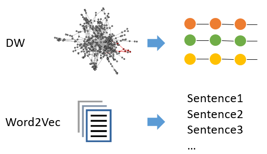 说到生成向量表示,最有名的莫过于Word2Vec了,那么是不是可以将network embedding的问题转化为熟悉的word embedding形式呢?这样我们就可以借用word2vec的思想来解决了。